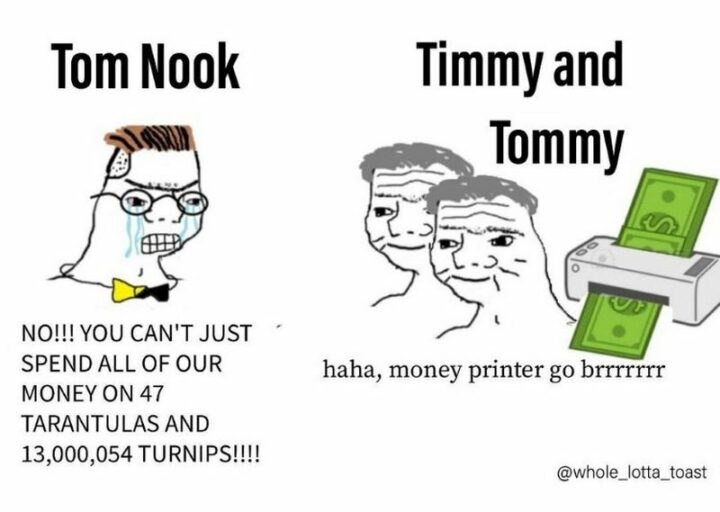 39) “Tom Nook: No!!! You can’t just spend all of our money on 47 tarantulas and 13,000,054 turnips!!!! Timmy and Tommy: Haha, money printer go brrr.”