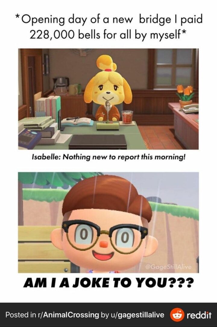 40) “*Opening day of a new bridge I paid 228,000 bells for all by myself* Isabelle: Nothing new to report this morning! Am I a joke to you???”