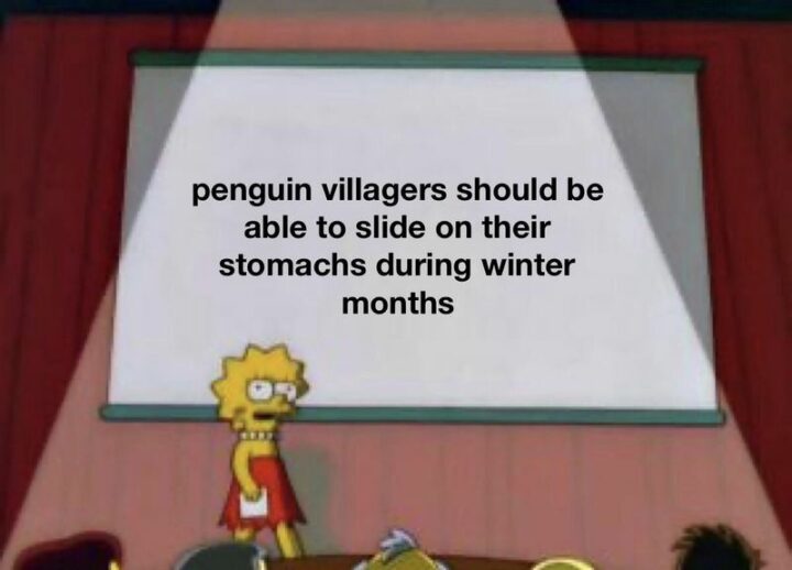 41) “Penguin villagers should be able to slide on their stomachs during winter months.”