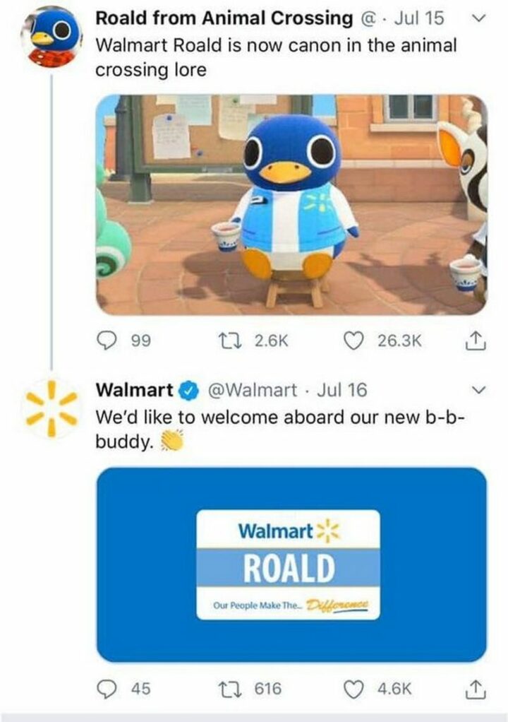 43) “Walmart Roald is now canon in the Animal Crossing lore. We’d like to welcome aboard our new b-b-buddy.”