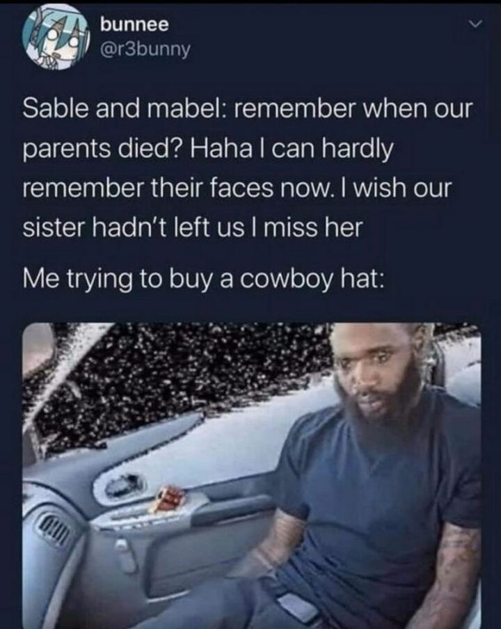 45) “Sable and Mabel: Remember when our parents died? Haha, I can hardly remember their faces now. I wish our sister hadn’t left us. I miss her. Me trying to buy a cowboy hat:”