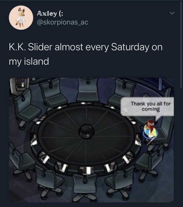 49) “K. K. Slider almost every Saturday on my island: Thank you all for coming.”