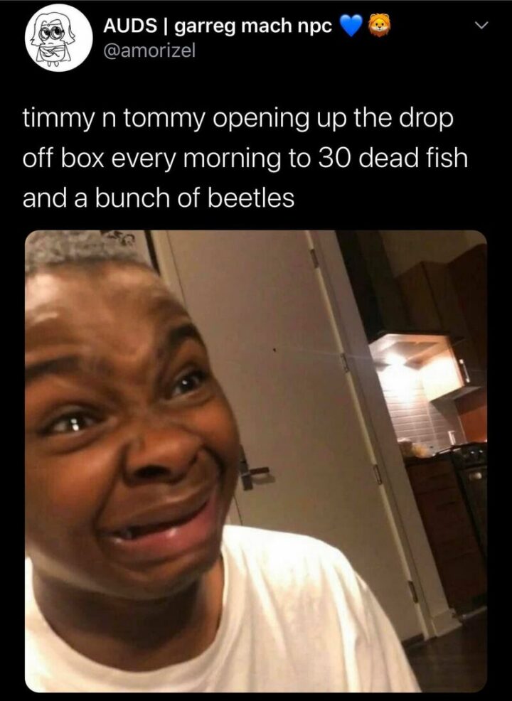 55) “Timmy and Tommy opening up the drop-off box every morning to 30 dead fish and a bunch of beetles.”
