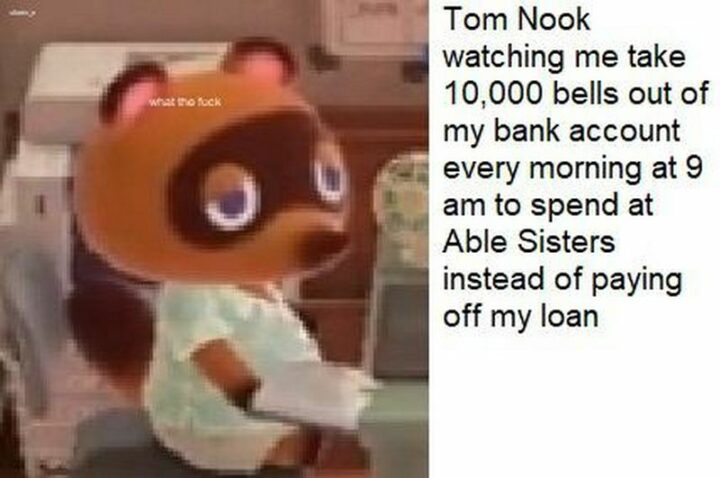56) “Tom Nook watching me take out 10,000 bells out of my bank account every morning at 9 am to spend at Able Sisters instead of paying off my loan.”