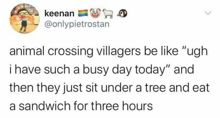 62) “Animal Crossing villagers be like ‘Ugh I have such a busy day today’ and then just sit under a tree and eat a sandwich for three hours.”