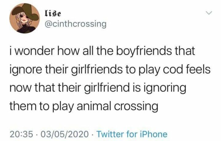 69) “I wonder how all the boyfriends that ignore their girlfriends to play Call of Duty feel now that their girlfriend is ignoring them to play Animal Crossing.
