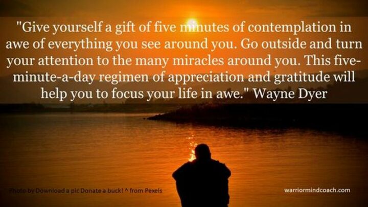16) “Give yourself a gift of five minutes of contemplation in awe of everything you see around you. Go outside and turn your attention to the many miracles around you. This five-minute-a-day regimen of appreciation and gratitude will help you to focus your life in awe.” – Wayne Dyer