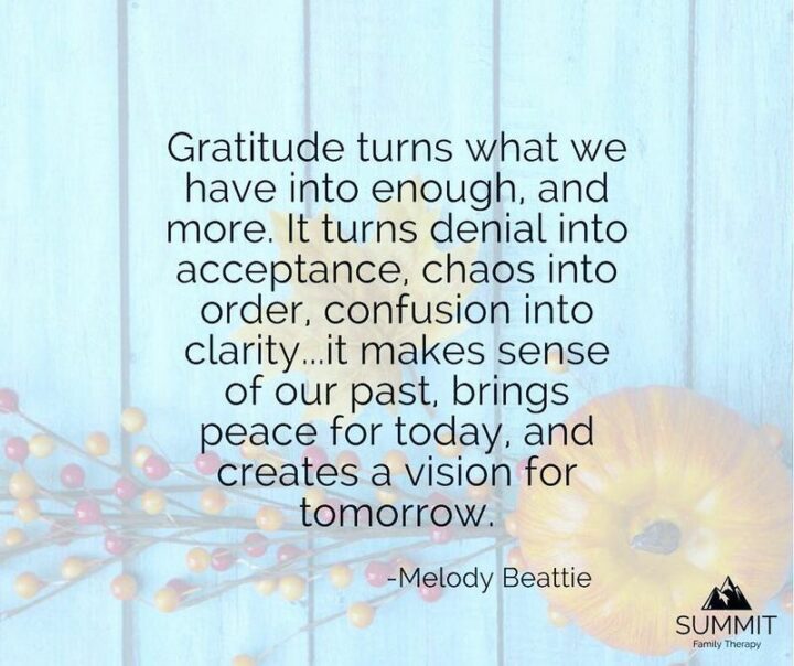 17) “Gratitude turns what we have into enough, and more. It turns denial into acceptance, chaos into order, confusion into clarity…it makes sense of our past, brings peace for today, and creates a vision for tomorrow.” – Melody Beattie