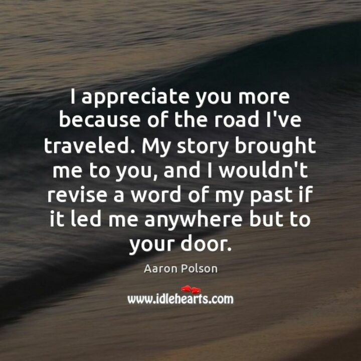 19) “I appreciate you more because of the road I’ve traveled. My story brought me to you and I wouldn’t revise a word of my past if it led me anywhere but to your door.” – Aaron Polson