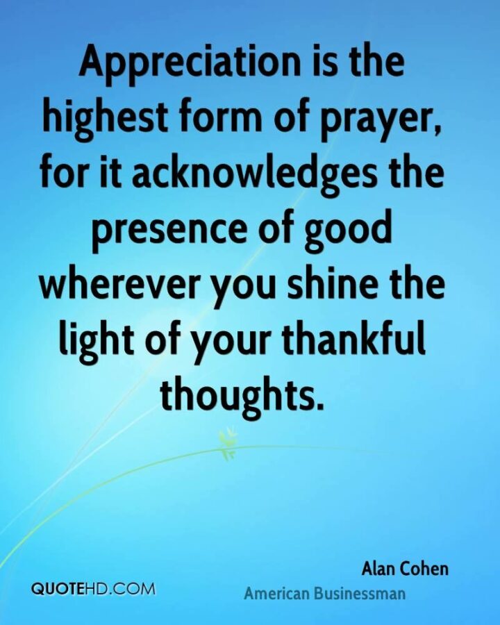22) “Appreciation is the highest form of prayer, for it acknowledges the presence of good wherever you shine the light of your thankful thoughts.” – Alan Cohen