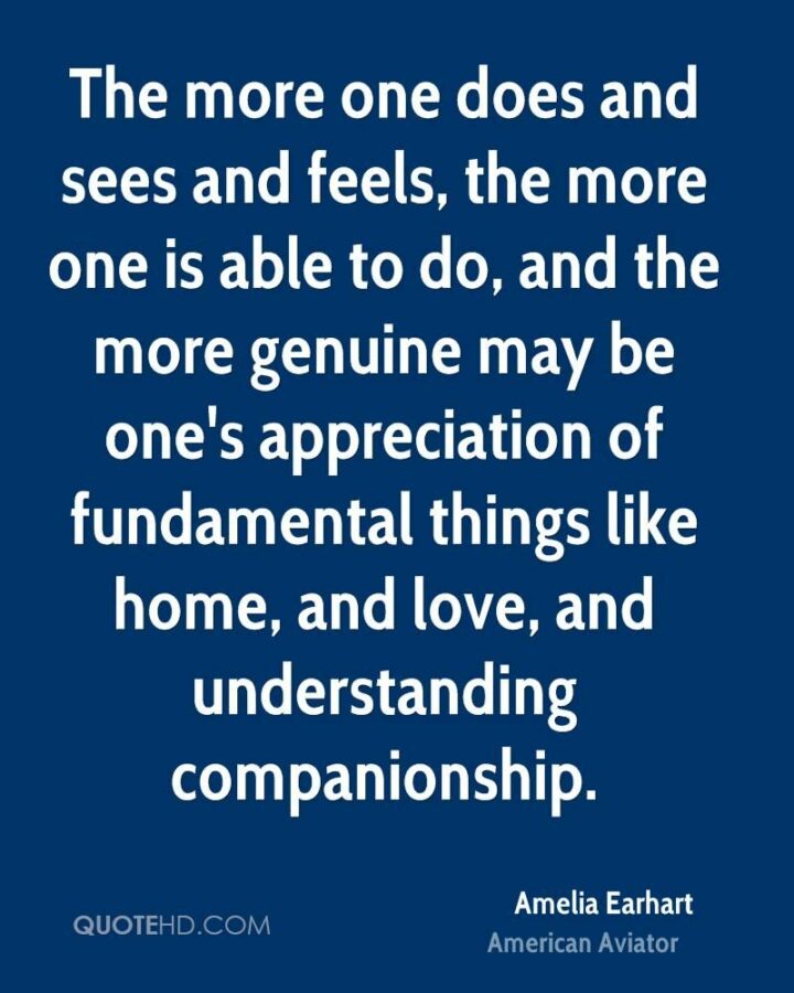 29) “The more one does and sees and feels, the more one is able to do, and the more genuine may be one’s appreciation of fundamental things like home, and love, and understanding companionship.” – Amelia Earhart