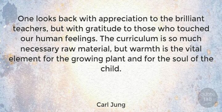 30) “One looks back with appreciation to the brilliant teachers, but with gratitude to those who touched our human feelings. The curriculum is so much necessary raw material, but warmth is the vital element for the growing plant and for the soul of the child.” – Carl Jung