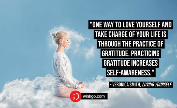 44) “One way to love yourself and take charge of your life is through the practice of gratitude. Practicing gratitude increases self-awareness.” – Veronica Smith, Loving Yourself