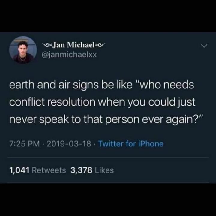 “Earth and air signs be like ‘Who needs conflict resolution when you could just never speak to that person ever again?”