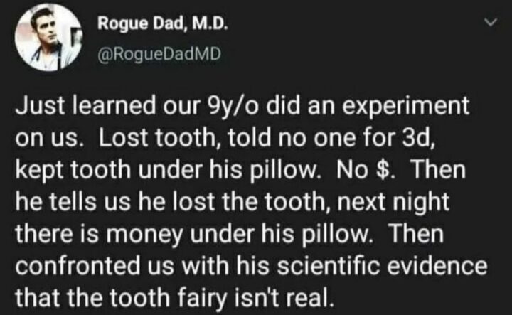 “Just learned our 9-year-old experimented on us. A lost tooth. Told no one for 3 days and kept the tooth under his pillow. No $. Then he tells us he lost the tooth, and the next night there is money under his pillow. Then confronted us with his scientific evidence that the tooth fairy isn’t real.”