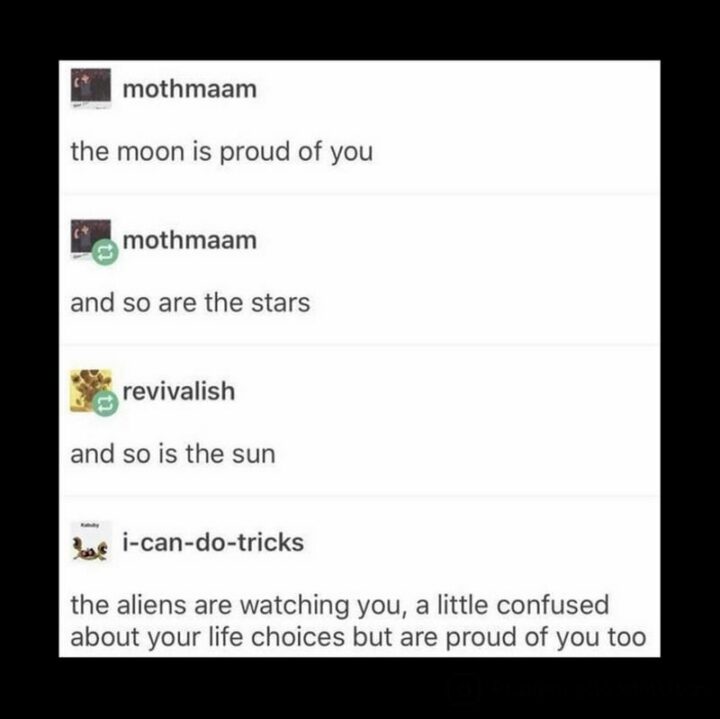 “The moon is proud of you and so are the stars and so is the sun. The aliens are watching you, a little confused about your life choices but are proud of you too.”