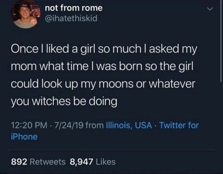 “Once a liked a girl so much I asked my mom what time I was born so the girl could look up my moons or whatever you witches be doing.”