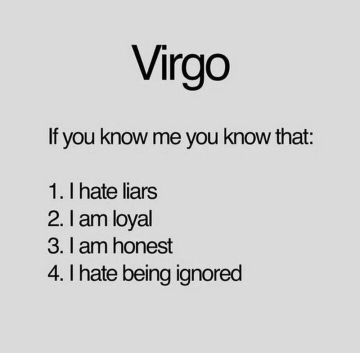“Virgo. If you know me you know that: 1) I hate liars. 2) I am loyal. 3) I am honest. 4) I hate being ignored.”