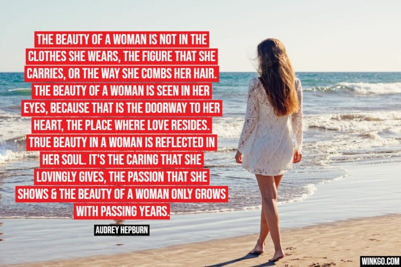 6) “The beauty of a woman is not in the clothes she wears, the figure that she carries, or the way she combs her hair. The beauty of a woman is seen in her eyes, because that is the doorway to her heart, the place where love resides. True beauty in a woman is reflected in her soul. It’s the caring that she lovingly gives, the passion that she shows & the beauty of a woman only grows with passing years.” – Audrey Hepburn