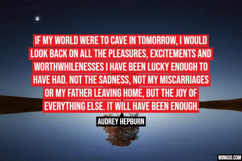 30) “If my world were to cave in tomorrow, I would look back on all the pleasures, excitements and worthwhilenesses I have been lucky enough to have had. Not the sadness, not my miscarriages or my father leaving home, but the joy of everything else. It will have been enough.” – Audrey Hepburn