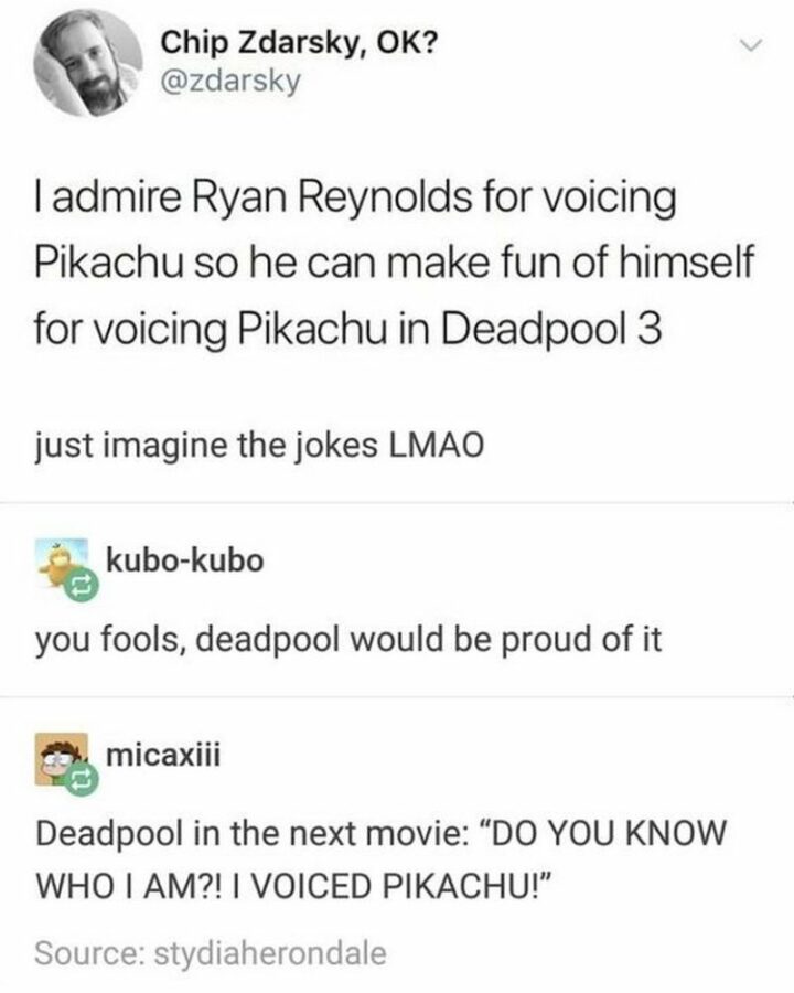 “I admire Ryan Reynolds for voicing Pikachu so he can make fun of himself for voicing Pikachu in Deadpool 3. Just imagine the jokes LMAO. You fools, Deadpool would be proud of it. Deadpool in the next movie: Do you know who I am?! I voiced Pikachu!”