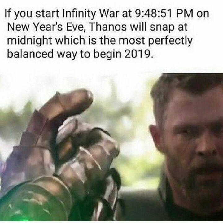 “If you start Infinity War at 9:48:51 pm on New Year’s Eve, Thanos will snap at midnight which is the most perfectly balanced way to begin 2019.”