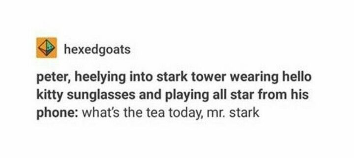 “Peter, heelying into Stark tower wearing Hello Kitty sunglasses and playing ‘All Star’ from his phone: What’s the tea today, Mr. Stark.”
