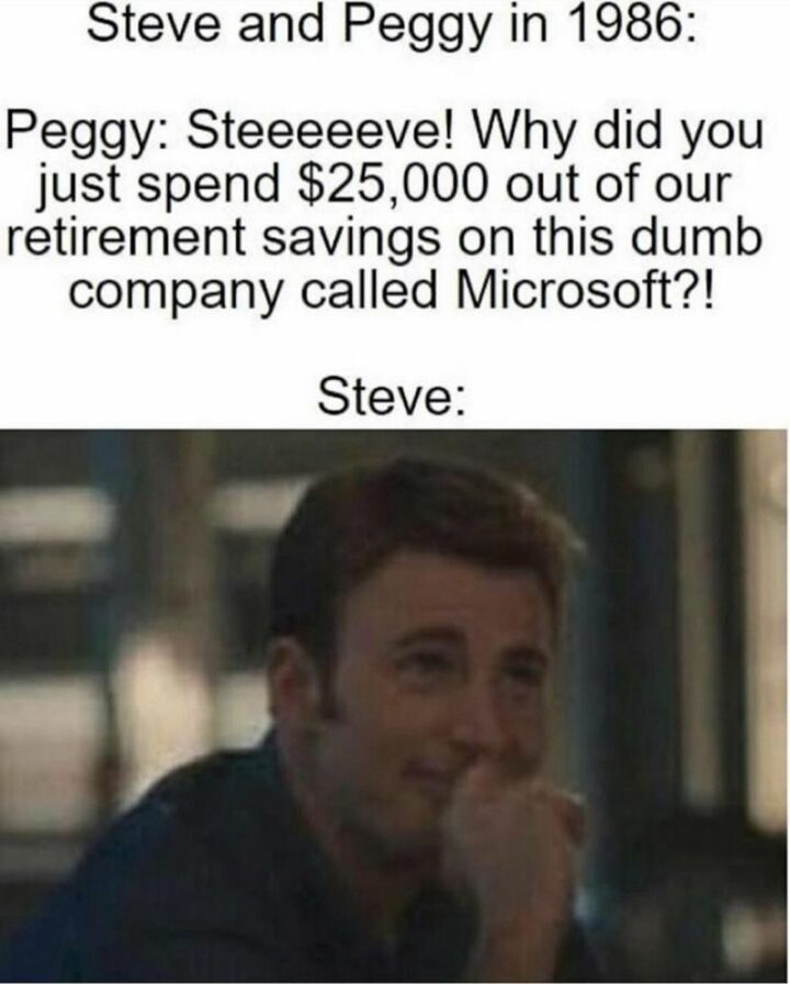“Steve and Peggy in 1986: Peggy: Steve! Why did you just spend $25,000 out of your retirement savings on this dumb company called Microsoft?! Steve:”