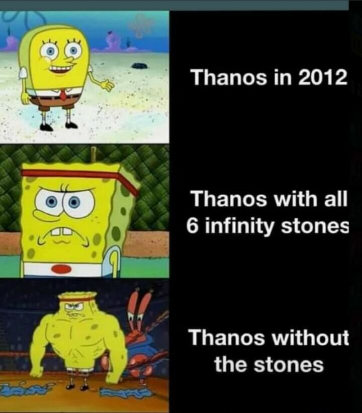 “Thanos in 2012. Thanos with all 6 infinity stones. Thanos without the stones.”