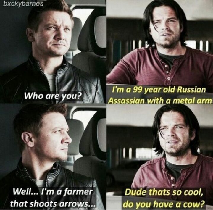 “Who are you? I”m a 99-year-old Russian assassin with a metal arm. Well…I’m a farmer that shoots arrows…Dude that’s so cool, do you have a cow?”