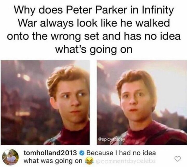 “Why does Peter Parker in Infinity War always look like he walked onto the wrong set and has no idea what’s going on. Because I had no idea what was going on.”