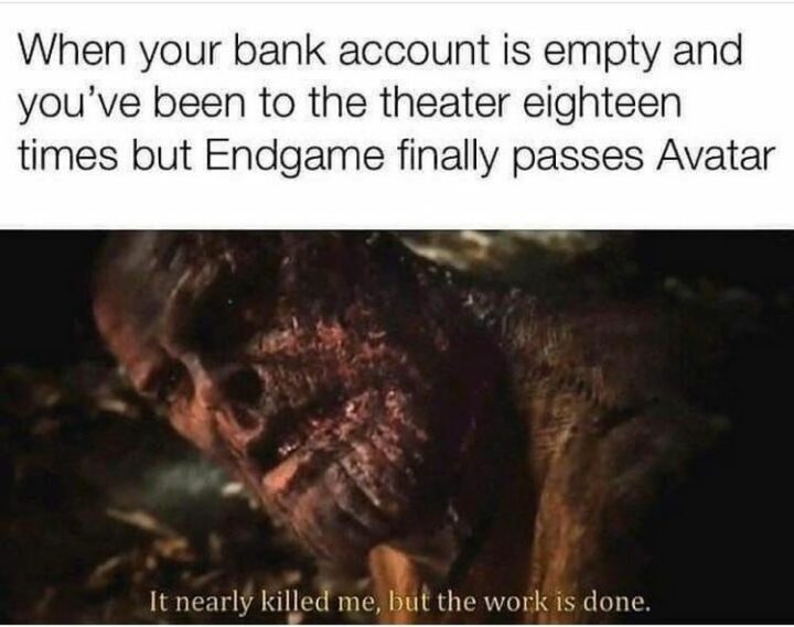 “When your bank account is empty and you’ve been to the theater eighteen times but Endgame finally passes Avatar: It nearly killed me, but the work is done.”