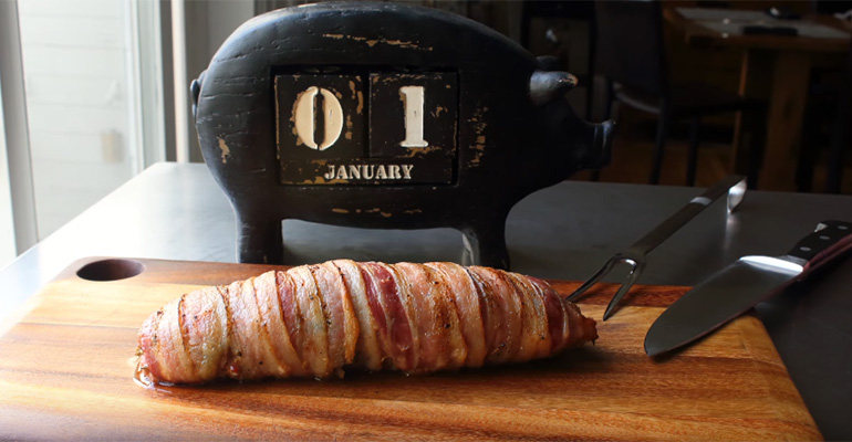 If you love pork tenderloin, this recipe for bacon-wrapped pork tenderloin, also called a “New Year’s Baby” Porchetta, will make your mouth water. He begins this mini porchetta recipe by creating a paste and spreading it on the inside and outside of his pork tenderloin. Then, it is wrapped in bacon and cooked to perfection.