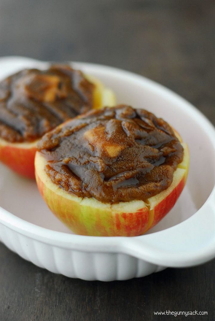 Put apples in an oven dish and drop two caramels into the center of each apple.