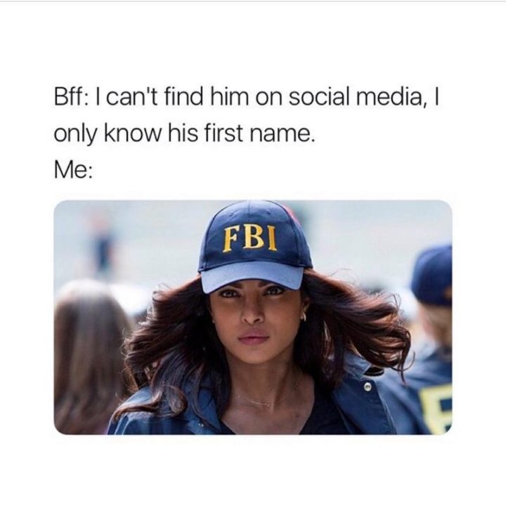 “Bff: I can’t find him on social media, I only know his first name. Me:”