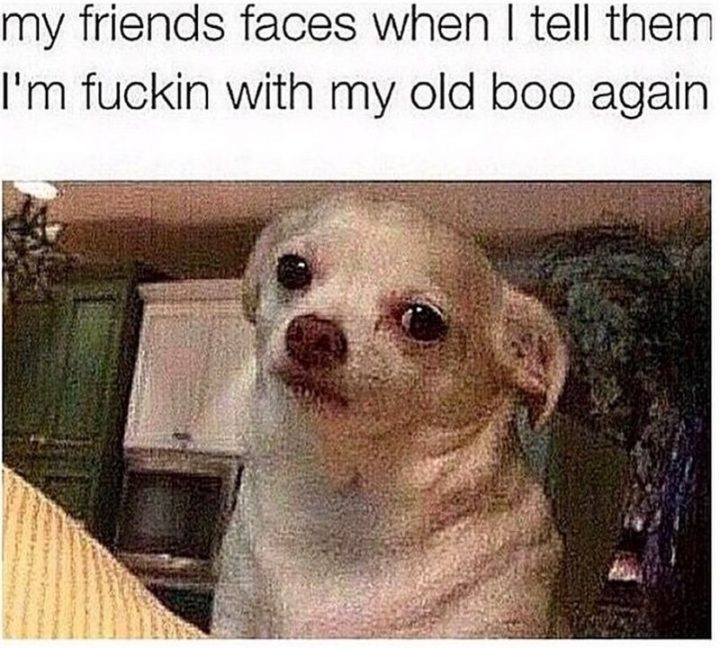 “My friend’s faces when I tell them I’m f***in’ with my old boo again.”