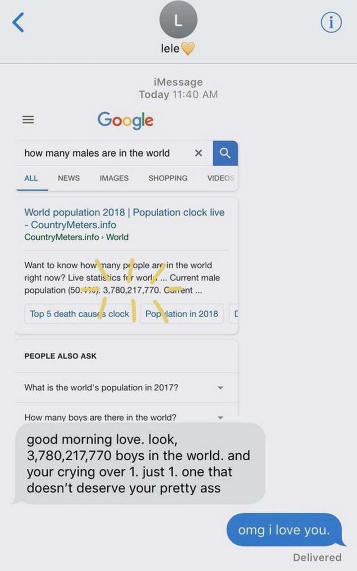 “How many males are there in the world? Current male population is 3,780,217,700. Good morning love. Look, 3,780,217,700 boys in the world. And you’re crying over 1. Just 1. One that doesn’t deserve your pretty arse. OMG, I love you.”