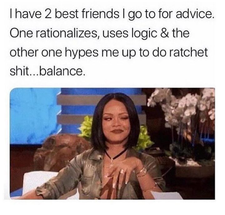 “I have 2 best friends I go to for advice. One rationalizes, uses logic and the other one hypes me up to do ratchet crap…balance.”