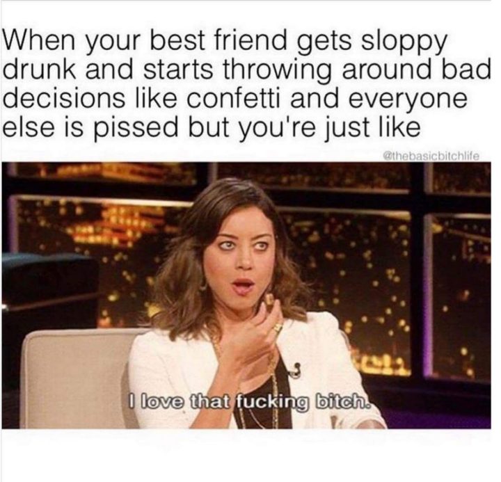 “When your best friend gets sloppy drunk and starts throwing around bad decisions like confetti and everyone else is pissed but you’re just like, ‘I love that f***ing b***h.'”