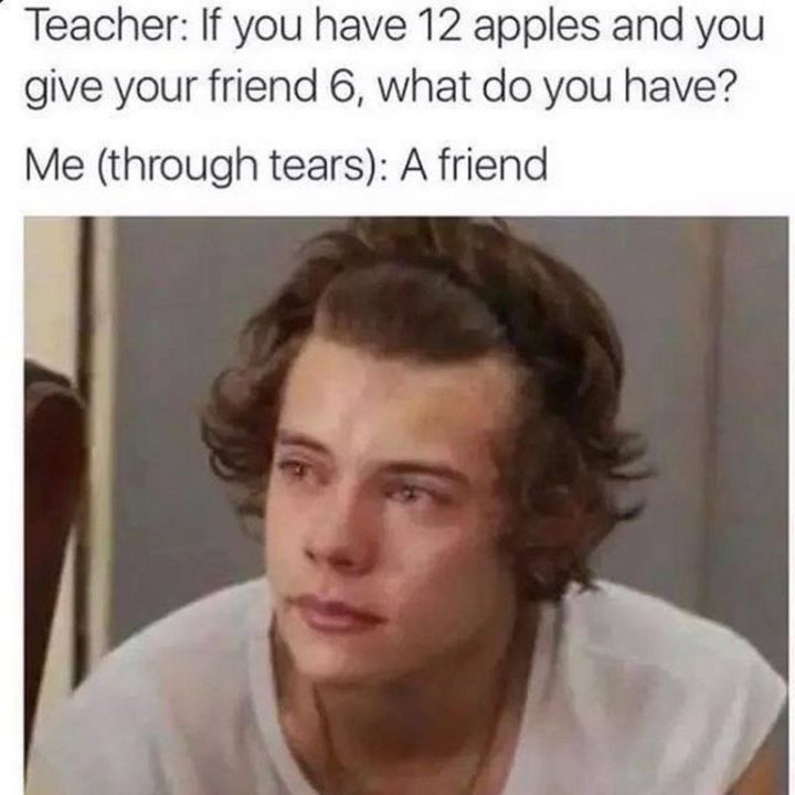 “Teacher: If you have 12 apples and you give your friend 6, what do you have? Me (through tears): A friend.”