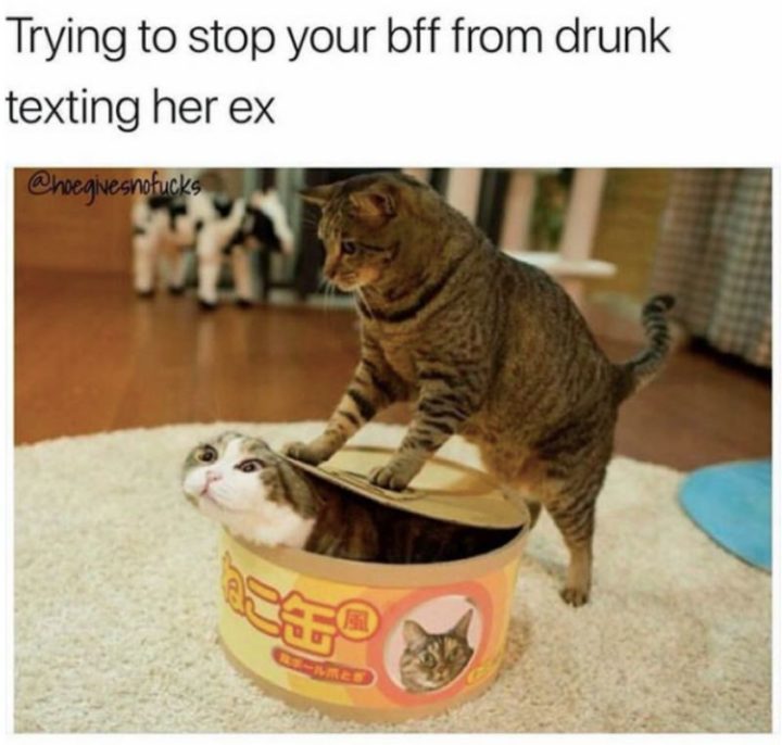 “Trying to stop your BFF from drunk texting her ex.” If you love cats, don’t miss these equally funny cat memes.