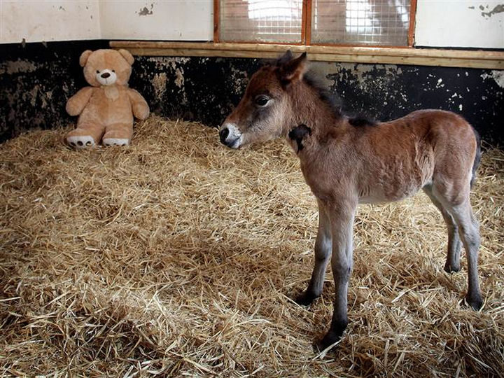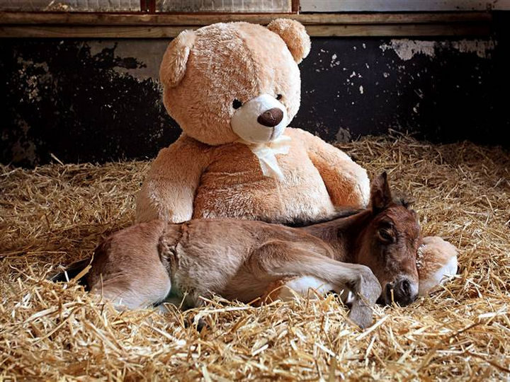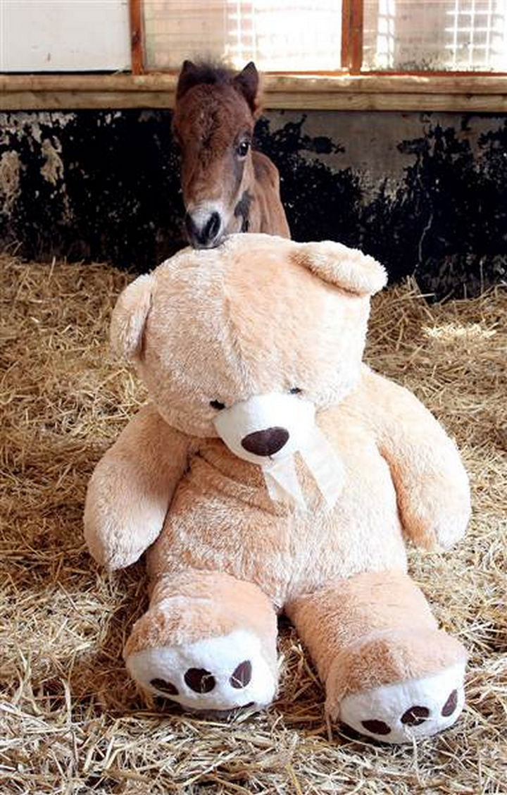 After being rescued by the Mare and Foal Sanctuary, they placed a huge teddy bear in with him and Breeze the newborn foal quickly warmed up to him.