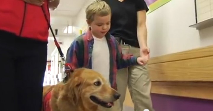 Please share the amazing recovery of Caleb with the help of Kernel the golden retriever therapy dog with friends and family.