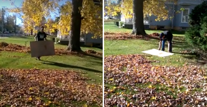 Watch a man raking leaves effortlessly with a piece of cardboard!