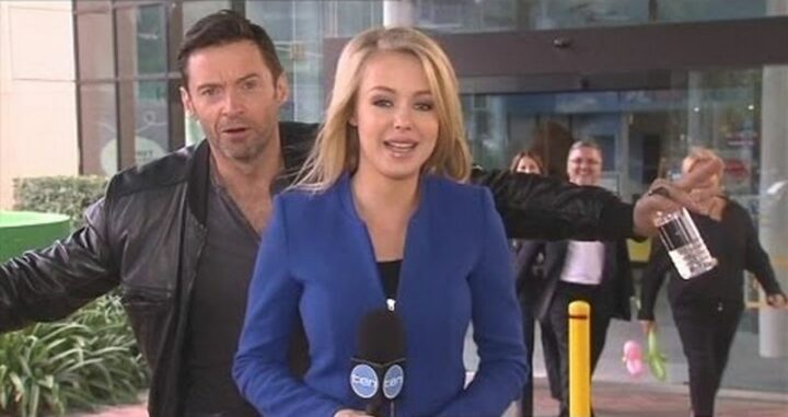 16) Hugh Jackman celebrity photobombs Ten News reporter Jessica Turner.