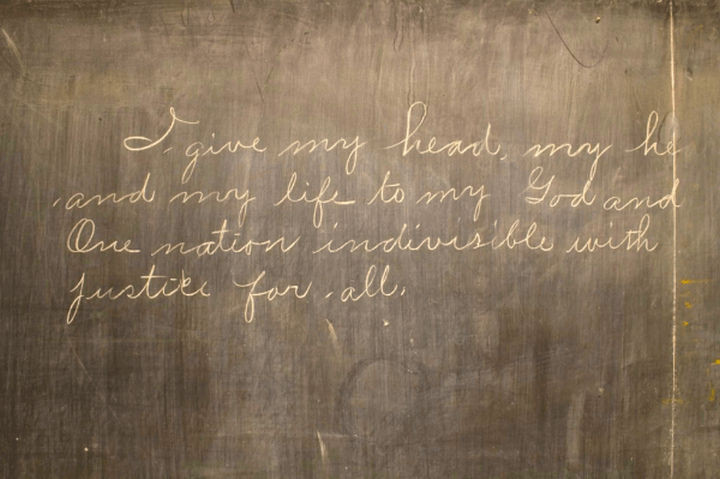 It reads, “I give my head, my heart, and my life to my God and One nation indivisible with justice for all.”