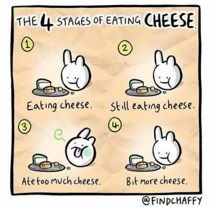 “The 4 stages of eating cheese: Eating cheese. Still eating cheese. Ate too much cheese. A bit more cheese.”