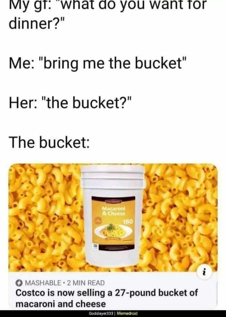 “My girlfriend: What do you want for dinner? Me: Bring me the bucket. Her: The bucket? The bucket: Costco is now selling a 27-pound bucket of macaroni and cheese.”