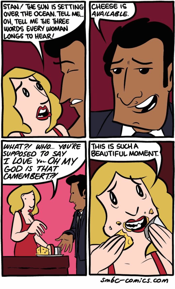 “Stan! The sun is setting over the ocean. Tell me…Oh, tell me the three words every woman longs to hear! Cheese is available. What?! Who…You’re supposed to say I love you. Oh my god is that camembert?! This is such a beautiful moment.”