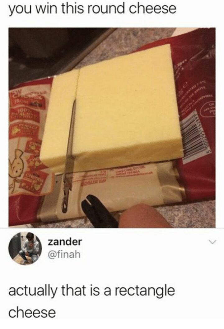 “You win this round cheese. Actually, that is a rectangle cheese.”